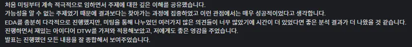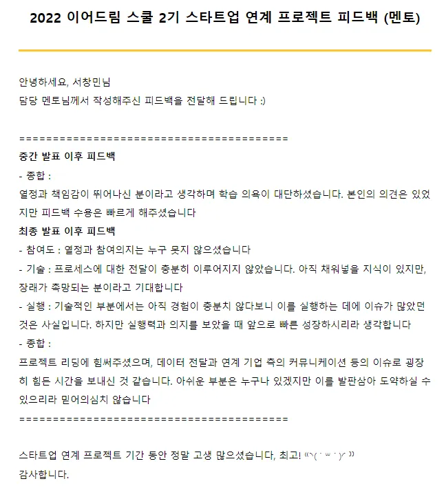 아쉬웠던 부분은 기업이 바쁜 관계로 프로젝트를 진행하는 데 문제가 있었음에도 피드백을 일주일에 한 번밖에 받지 못했던 점입니다. 데이터를 늦게 받아 프로젝트를 바로 시작하지 못했던 점도 아쉬웠습니다.